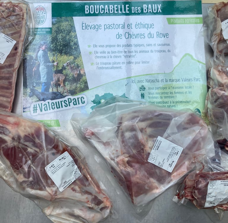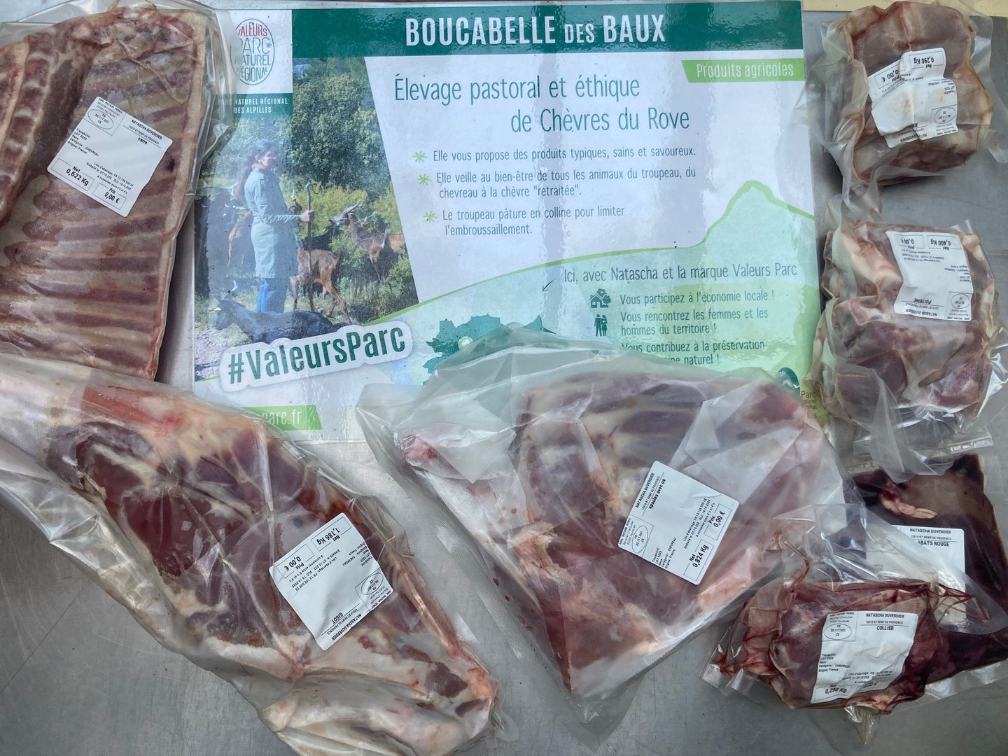 Les chevreaux sont élevés au minimum deux mois sous la mère puis partiellement sevrés. Ils ne reçoivent qu'en complément de l'orge ou du méteil local, du Foin de Crau et un peu de luzerne. Et surtout dès que possible, ils gambadent en colline. La viande des chèvres du Rove est maigre, la chair fine et goûteuse sans être forte. Elle se prépare à toutes les sauces et on vous donne les meilleures recettes à la livraison.