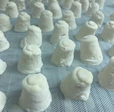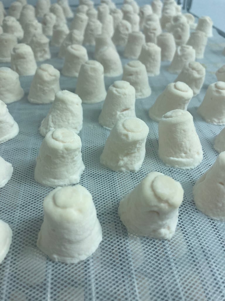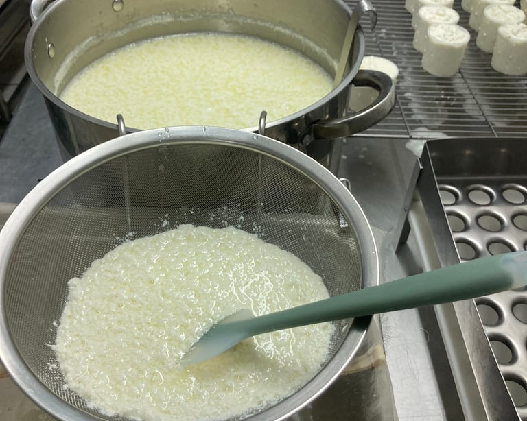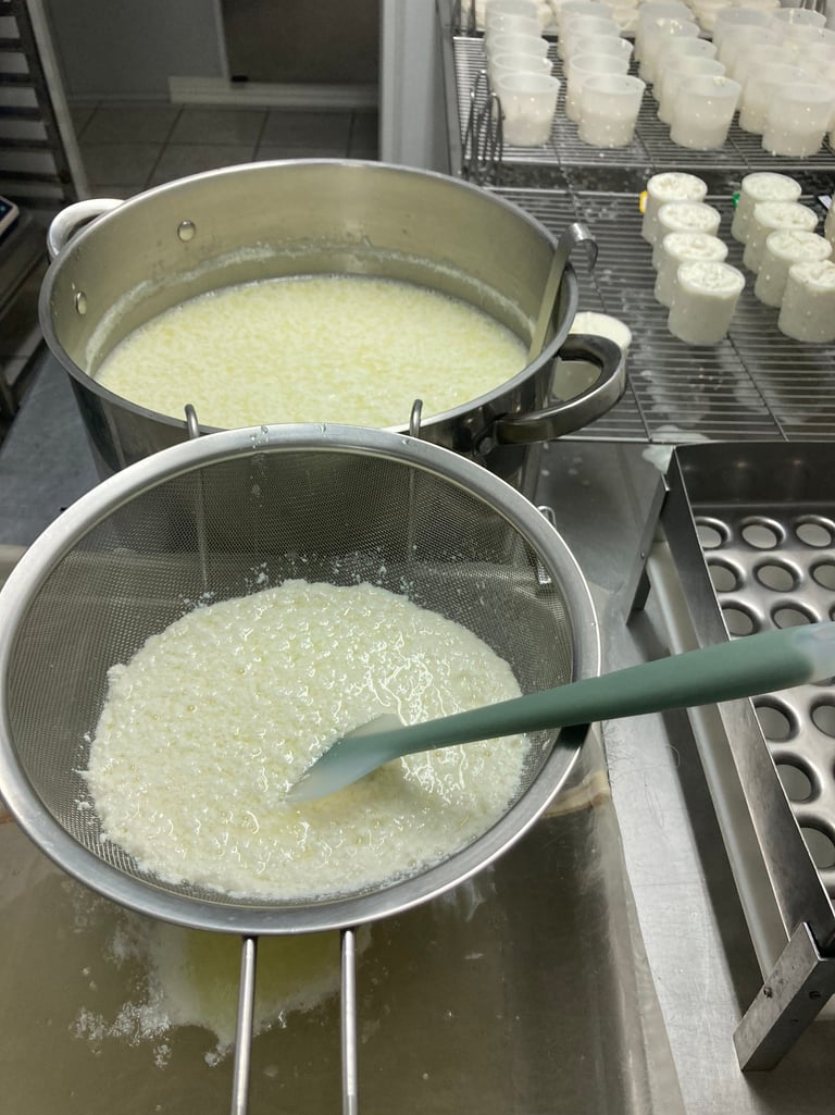 Seule brousse faite a partir du lait entier cru de Rove, directement au sortir de la traite, chauffé entre 85 et 90C puis refroidi doucement a 72C, la floculation ("le broussage") s'obtient grâce à l'ajout d'un soupçon de vinaigre blanc. Cette matière est passée à l'écumoire pour obtenir un mélange floconneux et soyeux qui sera délicatement versé dans les cornets à brousse.
